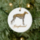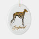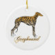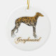 Röd brindle greyhound på keramisk julprydnad med texten "Greyhound".