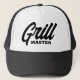 Grill Master truckerkeps för BBQ party chef. Anpassningsbar svart och vit basebollsockel med manustypografi. Snyggt för handskriftsformat för grillmaster. Finns i coola färg. Lägg till din egen humoristiska text valfritt. Roligt Sommardagskorgen för pappa, make, pojkvän, morfar, morfar, vän, bos, medarbetare, kollega, pensionär osv.
