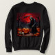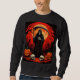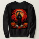En nedkylande bild av Grim Reaper bland pumpor, döskallar och barren träd under glöden av ett rött måne. Perfekt för Halloween-teman och representera höstnätterna.