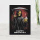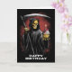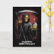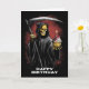 Send your birthday wishes with a quirky twist! This bold birthday card features the Grim Reaper and his scythe holding a cupcake topped with a single burning candle. It’s the perfect way to celebrate another trip around the sun with humor and style.