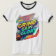 Den här öga-tagningsdesignen med t-shirt har den motiverade frasen "Grind, Gain, Glory" i ett fet teckensnitt med flera färgader. Utformningen innehåller linjer och former som skapar en känsla av energi och rörelse. Det skulle utgöra ett underbart tillägg till varje krigsherre och vara som en påminnelse om att målsättningarna måste eftersträvas med beslutsamhet.