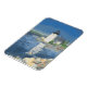 Grindle Point Lighthouse flexibel magnet. Denna magnet visar Grindle Point Lighthouse som lyser i den sena morgonsolen på en vårdag i Islesboro, Maine. Målningen använder en strålande palett av blå, gröna, grå och orange toner för att skapa en vacker och lugn vy av det unika fyrhuset i fyrkant och fyrvaktarens hus.