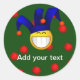 Gräva gult ansikte med en ljusblå jesthat som kontrasterar orange klockor.