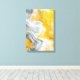 The artwork utilizes expansive areas of pure white to enhance the luminosity of the yellow, while the grey adds depth and sophistication. Scattered splatters and droplets across the surface add texture and maintain the spontaneous, liquid feel of the piece. The overall effect is a highly modern and powerful statement piece that draws inspiration from the current trend of using vibrant accents against neutral tones.