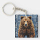 Livlig konst som skildrar en björn med en rik, texturerad päls, mot en lapptäcksbakgrund med blå och grå toner. Björnen står imponerande och livaktig och fångar uppmärksamheten med sina realistiska drag.