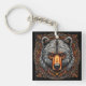 Mycket stiliserad illustration av ett björnars huvud, avbildat med intrikata detaljer och livfulla färger. Björnens päls är huvudsakligen grå med antydningar av orange runt nosen, vilket ger den ett slående utseende. Dess ögon är intensiva och fängslande och bidrar till djurets kraftfulla uttryck. Björnen är omgiven av en utsmyckad dekorativ ram som ger kompositionen en konstnärlig prägel och rikedom. Bakgrunden är svart, vilket förstärker den övergripande dramatiken och djupet i verket och får björnen att framstå i tydlig relief. Kombinationen av färger och intrikata mönster skapar ett visuellt övertygande konstverk som förmedlar styrka och majestät.