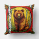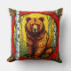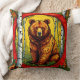 Grizzlybjörn som sitter i en frodig grön skog omgiven av björkar, inramad av dekorativ lövverk.