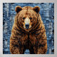 Livfull konst som skildrar en björn med en rik, texturerad päls, mot en lapptäcksbakgrund med blå och grå nyanser. Björnen står imponerande och livaktig, fångar uppmärksamheten med sina realistiska drag.