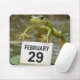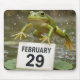 En groda hoppar över en kalendersida markerad 29 februari, med gnistrande vattendroppar och en livfull grön bakgrund som symboliserar ett skottår.