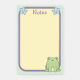 Söta anteckningar med en kawaii, tecknad, grön groda i det nedre högra hörnet. Överst på anteckningarna finns två glada blå stjärnor på vardera sidan om ordet Anteckningar som är i en ljus pastellfärg lila. Området för att skriva dina anteckningar är i en pastellgul färg med en pastell lila kant. Bakgrunden är en pastellgrön med små vita prickar. Perfekt att lägga till dina barns skolmaterial.