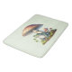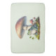En badrumsmatt med en cool illustration. Med en grön groda som sitter på en grästuva. En stor röd svamp som skyddar honom från väder och vind. Ett par små svampar i närheten.