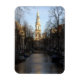 Ett foto av Groenburgwal-kanalen i Amsterdam, Nederländerna. Kyrkan i bakgrunden är kyrkan i Zuiderkerk.