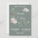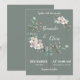 En elegant bröllopsinbjudan inspirerad av naturens skönhet, med en cirkulär ram av mjuka blommor och lugna gröna blad som tillför en touch av sofistikering och harmoni. Den raffinerade olivgröna bakgrunden ger inbjudan en klassisk men ändå modern känsla, vilket gör den till ett idealiskt val för både underdrivna och lyxiga bröllop.
