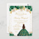 Denna eleganta och glamourösa Quinceañera-födelsedagsinbjudan presenterar en vacker prinsessa med mörkt hår i en krona och grön bollsrok. Texten kombinerar handskriven skrift och moderna sans serif-teckensnitt för en klassisk och sofistikerad look. De blomsterarrangemangen och det gyllene konfettit skapar den perfekta blandningen av rustik och chic.