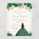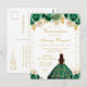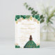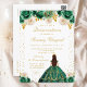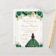 Denna eleganta och glamourösa Quinceañera-födelsedagsinbjudan visar en vacker prinsessa med mörkt hår i en krona och grön balklänning. Texten kombinerar handskriven skrift och moderna sans serif-teckensnitt för en klassisk och sofistikerad look. Blomsterarrangemangen och det gyllene konfettit skapar den perfekta blandningen av rustik och chic.