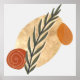 En boho-inspirerad design med enkla former i rustika färger som brun, beige och orange med en blommande växtstjälk som fokus.