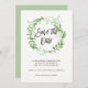 Detta eleganta botaniska kort för att spara datumet har en grön krans av blad på en ren vit bakgrund. Vi har använt konst från LABFcreations.