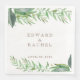 Vattenfärggröna nyanser för enkla bladrika sprayer. Bladverket är skärmat med vit överlagring och namn och datum kan anpassas. Typsnittets färg är granitbrun.