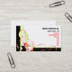 En modern konstnärlig visitkort i rött, görar grön, svärtar, och vit.