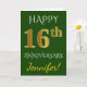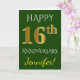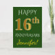 Denna enkla, personliga gratulationskortdesign för årsdagar har meddelandet "GLAD 16-ÅRSDAG", där "16:e" har ett falskt guldliknande utseende. Framsidan har också ett anpassat namn och en grön bakgrund. Insidan har ett anpassat gratulationsmeddelande för årsdagen. Det kan ges till en make eller maka för att fira parets sextonårsdag. [~Z0000086]