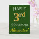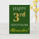 Denna enkla, personliga gratulationskortdesign för bröllopsjubileum har meddelandet "LYCKLIGT 3-ÅRSJUBILEUM", där "3" har en falsk guldliknande look. Framsidan har också ett personligt namn och en grön bakgrund. Insidan har ett anpassat gratulationsmeddelande för bröllopsjubileum. Det kan ges till en make eller maka för att fira parets tredje bröllopsjubileum. [~Z0000086]
