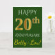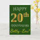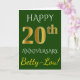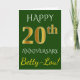 Denna enkla, personliga gratulationskortdesign för bröllopsjubileum har meddelandet "HAPPY 20th ANNIVERSARY", där "20th" har ett falskt guldliknande utseende. Framsidan har också ett personligt namn och en grön bakgrund. Insidan har ett anpassat gratulationsmeddelande för bröllopsjubileum. Det kan ges till en make eller en maka för att fira parets tjugoårsjubileum.