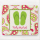 En mousepad som presenterar en illustration av en grönt, parar av flinflip flopsinsida som en vit kvadrerar med gröntklippning. Personifiera med ditt namn under flinflip flops. Bakgrund är rosa och gröna paisley. Sök efter att matcha objekt på den rosa schoolhousen.