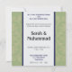 Ett mycket flott härligt inbjudankort för ditt förlovningsfest, katbal-kitabfirande, nikkah, walima eller bröllop. Slösa utsmyckad dekoration med initialer av bruden och ansa på grön bakgrund. Lite arabiskacalligraphy av Bismillah - i namn av Allah som är mest artig som är mest barmhärtig. Alla texter är anpassadet till dina behov, om du gillar för att ändra typsnitt eller färg, klickar på "skräddarsy". Älskar föredrar du designen men olika färger? Känselförnimmelsen frigör för att kontakta oss!