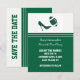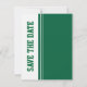 Roligt fotbollbröllop Save the Date-kort gjort i jägaregrönt och vitt. Grafik med en elegant grön stiletthögklackad sko som sparkar en grön-vit fotboll pryder den övre vita delen av kortet. Den nedre delen av kortet är grön, med anpassad vit text som är redo att anpassas med din bröllopsinformation. Baksidan är grön-vit med grön text som löper i sidled och läser Save The Date. Bra Save The Date-kort för det fotbollsfana paret.