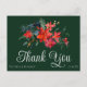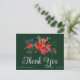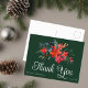 Det här vackra gröna anpassade julbröllopet tack-kort har en vacker akvarell av röda poinsettia blommor och tallbarr för jul. Eleganta vinterkort med festliga blommor för helgdagar. Anpassa med parets namn och bröllopsdatum.