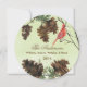 Ett vackert julkort att skicka till alla dina vänner och familjemedlemmar, med ett runt kort med en blekgrön akvarellbakgrund, tallkottar, trädgrenar, en röd kardinal och anpassningsbar text som lyder Högtidliga hälsningar på framsidan, samma gröna akvarellbakgrund, tallkottar, röd kardinal och grenar med ett anpassningsbart område för att lägga till ditt efternamn, förnamn och innevarande år på baksidan.
