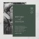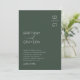 Minimalistiska eleganta bröllopsinbjudningar med en stilren grön bakgrund, era initialer i det övre högra hörnet, en elegant modern textmall med era namn och information om bröllopet.