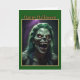 Den här halloween-kortet har en skräckinjagande detaljerad illustration av en ghul med grönfärgad hud, lysande orange ögon och hotfulla huggtänder. Ghulens vilda, gröna hår bidrar till den kusliga atmosfären och gör det till ett perfekt val för dem som njuter av halloween-skräck. Bilden är placerad mot en mörk, hotfull bakgrund med orden "Happy Halloween" som visas högst upp i ett klassiskt, fetstilt teckensnitt. Kortet är kantat i grönt och ger en sista touch till den övergripande kusliga designen. Det här kortet är idealiskt för att skicka rysningar nerför ryggen på vänner och familj som älskar en bra skräckupplevelse på halloween.
