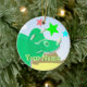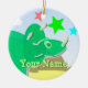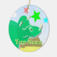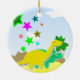 Grön prydnad för namn för TriceratopstecknadDinosaur. En gullig lite grön tecknadTriceratopsdinosaur och en förtjusande gul Diplodocus i etthistoriskt landskap med träd, berg och vulcanos med färgstjärnaprydnaden med anpassade ditt namn. Detta dinosgåvaobjekt är fullständigt anpassadet, tillfogar din texter och bilder! En underbar tecknaddinosaursprydnad för den stora lite dino fläkten!