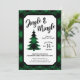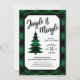 En festlig 'Jingle och Mingle' inbjudan till julfest med grön och svart buffalo-rutat ram och matchande träd-silhuett.