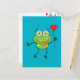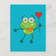 Grön långbent groda med roliga svälla ut ögon och stora head stunder som generously ler och att gå unsteadily och att klibba dess tunga ut, den hållande röda vanvettigt förälskade hjärtaballongen och känsla