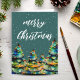 Grönt vattenfärg Julgran Snöflingor Semesterkort. Vattenfärg färgglad julgran på mörkgrön bakgrund med snöflingor. Du kan lägga till ditt eget meddelande inuti kortet eller sudda ut det.