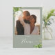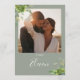 Dessa eleganta botaniska gröna blomsterbröllop bord nummer kan anpassas med ditt foto och bord nummer i chic typografi på en sage grön bakgrund. Kort trycks på framsidan och baksidan (dubbelsidig). Designad av Thisisnotme©