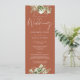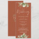 En grön blomsterbröllopsinbjudan med elegant kalligrafi-skrift typografi på en terrakotta-bakgrund. Designad av Thisisnotme©