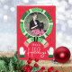 En grön buffel karotröja och prickar halsduk och vantar på en julröd bakgrund med snöflingor är ett fräscht traditionellt tillvägagångssätt för ditt julkort. Det är en bra färgkombination som kommer att se bra ut med alla dina julkläder.