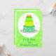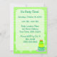 Dessa roliga födelsedagsinbjudningar är ett bra sätt att komma igång med din fest! Designen har en ljus limegrön bakgrund med ett mönster av vita ränder, prickar och stjärnor. Överst i mitten finns en vit oval med en stor trefaldig födelsedagstårta inuti. Denna trefaldiga födelsedagstårta har tre nivåer som består av olika nyanser av grönt. Den nedre nivån har vita stjärnor, den mittersta har vita ränder och den översta nivån har vita prickar. Det finns orange ljus på toppen med gula och röda gnistrande lågor! Denna roliga födelsedagstårta är ljus och färgglad! Under födelsedagstårtan finns text i en mörk blågrön font. Texten kan anpassas efter dina behov. Baksidan av inbjudan har samma limegröna bakgrund med ett mönster av ränder, prickar och stjärnor. Det finns ett vitt skuggat område för text och designen