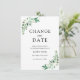 På grund av senaste händelser eller oförutsedda omständigheter kan du behöva skjuta upp ditt bröllop. Skicka dessa kort till dina gäster för att låta dem veta om datumändringen. Med orden "ändra datumet" i kalligrafi, omgivna av en ram av grönska och vita blommor.
