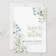 Uppsamling i bröllop med vackra vattenfärgade eleganter av blåa och vita blommor och grönska. Elegant och modern typografi och tidlös design i en modern layout för denna bröllopsinbjudan. Samlingen innehåller allt du behöver för att kasta en minnesvärd och elegant bröllop. Fotot ( Photography kredit: Jonathan Borba ) är en mall som kan bytas ut mot ett eget vackert par.