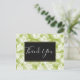 Ett tack-kort med ett upprepat mönster av stora palmblad på olivgrön bakgrund. Personligt meddelande på baksidan.