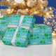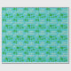 Grönt Shamrock-klöver Glad St. Patrick's Day Presentpapper. En Glad St. Patrick's Day-text med gröna irländska shamrock för tur. Klöver har fyra blad. Bakgrunden är levande blå. Du kan ändra texten.