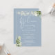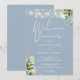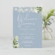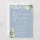 Eleganta strängljus blomstergrönska, dammig blå välkomstmiddagsinbjudan med era namn och repetitionens middagsdetaljer i chic text och era monograminitialer på baksidan. Designad av Thisisnotme©
