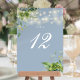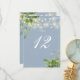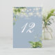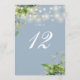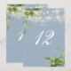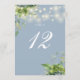 Dessa eleganta botaniska gröna blomstersträngljus bröllopsbordskort kan anpassas med chic typografi på en dammig blå bakgrund. Kortens framsida och baksida är tryckta (dubbelsidiga). Designad av Thisisnotme