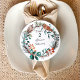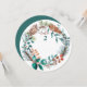 Vinterkrans med gröna tallbarr, bruna kottar och mjuk grön eukalyptus är vacker som namnskylt på bordet. Konstverk med städsegröna tallbarr är mångsidigt och passar till en mängd olika rost-, koppar-, bruna och skogsgröna brölloppsfärgscheman. Namnskyltar för vinterbröllop kan enkelt anpassas till en mängd olika rusticerade vinterbröllopsutskrifter.