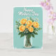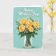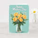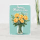 Det här kortet har en glad blomsterarrangemang mot en dämpad tealbakgrund som känns lugn och fräsch ❤️. En stor samling gula rosor sitter i mitten, med kronblad som skuggats för att se ut som om de är mjukt belysta, som om de glöder i det milda morgonljuset. Vissa blommor är täta knoppar medan andra är helt utslagna, vilket skapar en naturlig rytm som antyder att en omsorgsfull hand just har ställt dem där åt någon speciell. Små vita småblommor flyter mellan rosorna som små luftiga prickar, och djupt gröna blad ger rik kontrast runt buketten. Blommorna vilar i en klar glasvas nära nederkanten, med svaga höjdpunkter på glaset och smala stjälkar synliga inuti. Tvärs över den övre delen är ett flödande vitt meddelande placerat iögonfallande, som sticker ut mot den tealfärgade bak