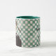 Personlig herrporträttmugg för en examen med ett grönt rutigt mönster i bakgrunden och klassen, examenens namn, examen, universitetets namn och en examenshatt-design på baksidan. För att skapa en utskuren bild, beskär din bild till önskat motiv och använd verktyget "ta bort bakgrund".